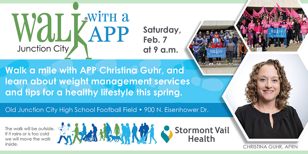 Old Junction City High School Football Field 900 N. Eisenhower Dr., Junction City, Kansas, United StatesWalk a mile with APP Christina Guhr and learn about weight management services and tips for a healthy lifestyle this spring. This APP-led group is a fun and safe place to go for a walk, hear briefly about an important health topic, and enjoy a walk with an APP. The event is FREE and all are…