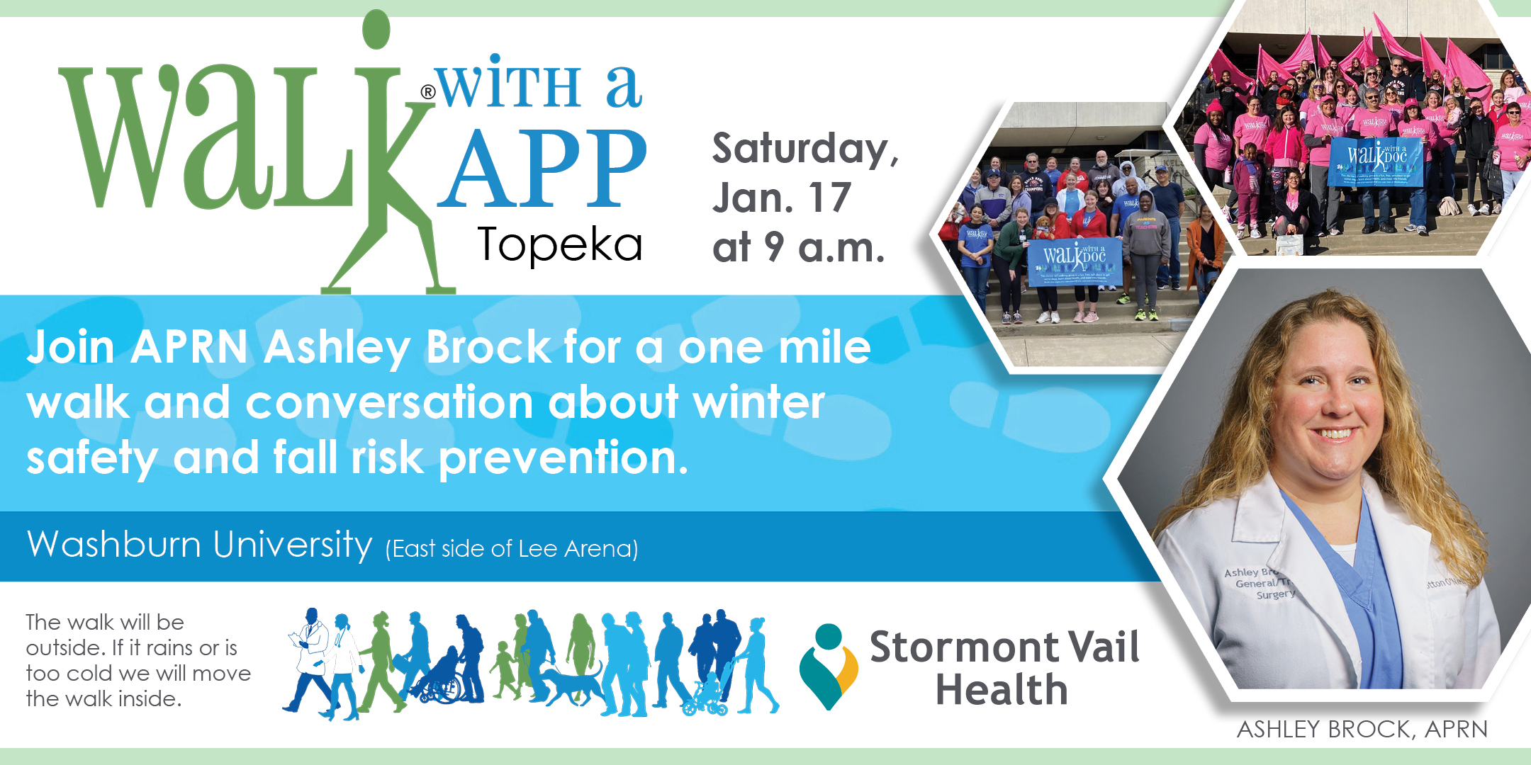 Washburn University - Lee Arena 1901 SW Mulvane St., Topeka, Kansas, United StatesJoin APRN Ashley Brock for a one mile walk and conversation about winter safety and fall risk prevention. This APP-led group is a fun and safe place to go for a walk, hear briefly about an important health topic, and enjoy a walk with an APP. The event is FREE and all are welcome! Ask your provider…